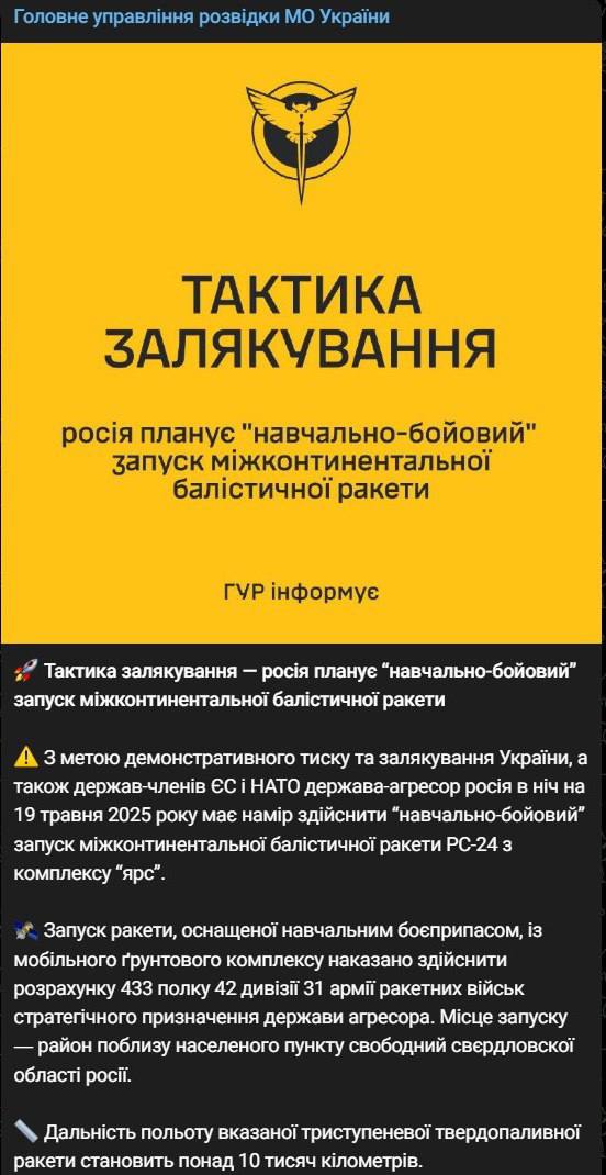 "Тактика запугивания". Ночью РФ планирует учебно-боевой запуск межконтинентальной баллистической ракеты - ГУР