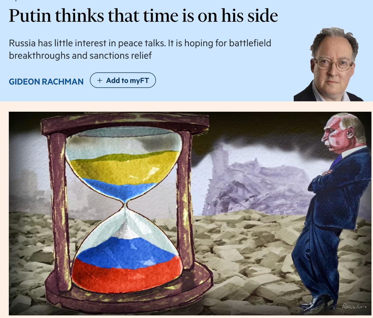 "При нынешнем положении дел, похоже, что шансы в пользу России. Давнее восхищение Трампа Путиным и его кипучий антагонизм по отношению к Зеленскому делают вероятным, что он первым потеряет терпение по отношению к украинскому лидеру. Трампа также привлекает идея возобновления деловых связей с Россией. Он предпочел бы подписать новые выгодные деловые сделки в Москве, чем согласиться на новые дорогостоящие поставки оружия в Украину", - делает вывод обозреватель FT Гидеон Рахман.