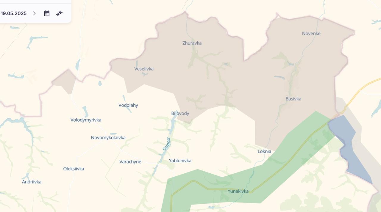 Это утверждается со ссылкой на кадры, опубликованные в милитари-пабликах 19 мая. Российские телеграм-каналы при этом пишут о захвате всей или большей части Локни (чего Украина не подтверждала) с целью выхода на Юнаковку и окончательного перерезания трассы на Суджу. Украинские военные паблики заявляют, что до этой дороги россиянам осталось полтора километра от Локни.
