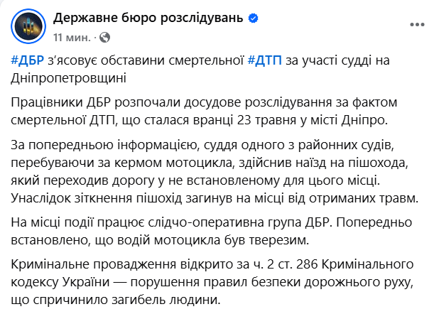 "Сотрудники ГБР начали досудебное расследование по факту смертельного ДТП, которое произошло утром 23 мая в городе Днепр", - говорится в сообщении.