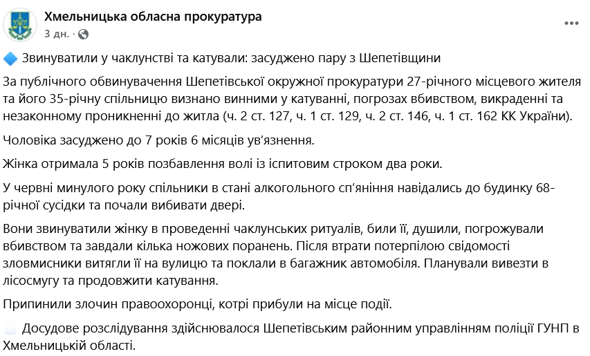 В Хмельницкой области мужчина и женщина пытали пожилую соседку, обвинив ее в колдовстве