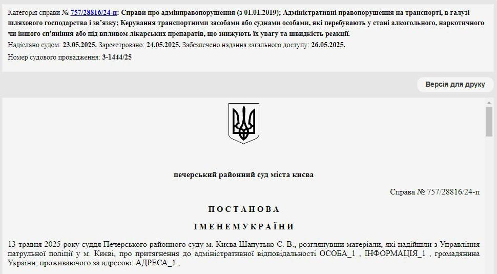 Как сказано в постановлении суда, ночью 30 мая 2024 года Найем ехал за рулем BMW по бульвару Михновского, будучи пьяным. Там его остановила полиция. Тест на "Драгере" показал 0,62 промилле алкоголя в его крови.