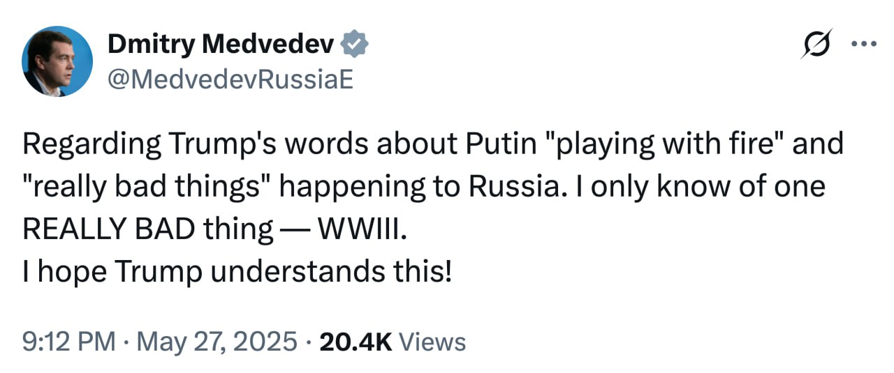 "Я знаю только одну действительно плохую вещь – это третья мировая. Надеюсь, Трамп это понимает!" – написал замглавы российского Совбеза.