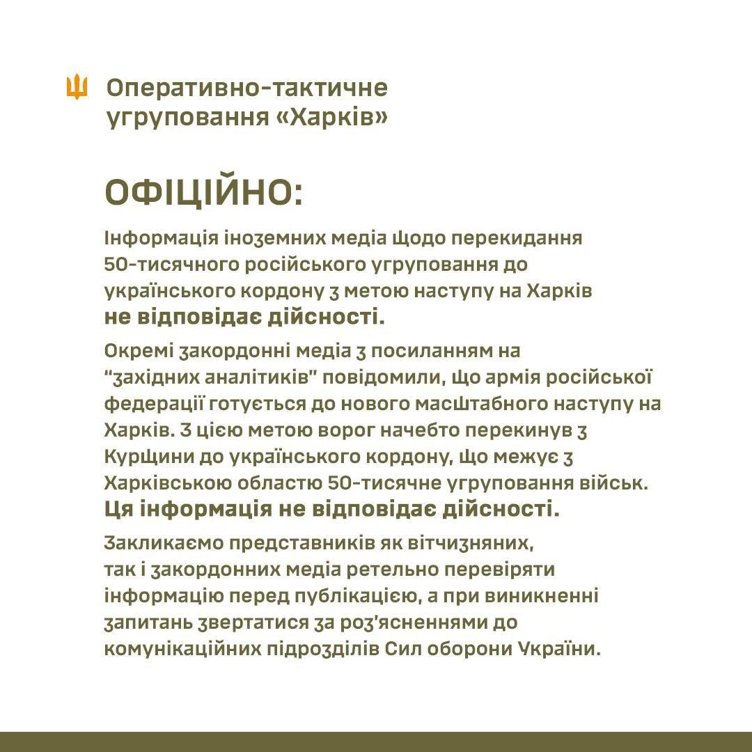 12.43 ВСУ опровергают, что РФ сосредоточила на границе 50-тысячную группировку с целью наступления на Харьков.