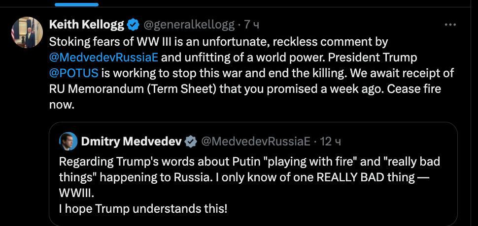 "Разжигание страхов перед третьей мировой войной - неудачный, безрассудный комментарий Дмитрия Медведева, неподобающий мировой державе. Президент Трамп работает над тем, чтобы остановить эту войну и положить конец убийствам. Мы ждем получения меморандума РФ (перечня условий), который вы обещали неделю назад. Прекратите огонь сейчас", - написал Келлог.