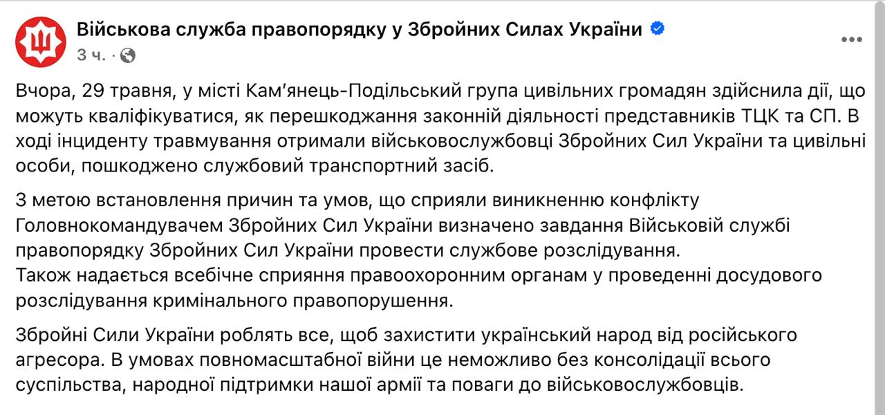 16:03 Главком Сырский поручил Военной службе правопорядка ВСУ расследовать причины и условия массового конфликта гражданских с ТЦК в Каменец-Подольском, сообщает ВСП.
