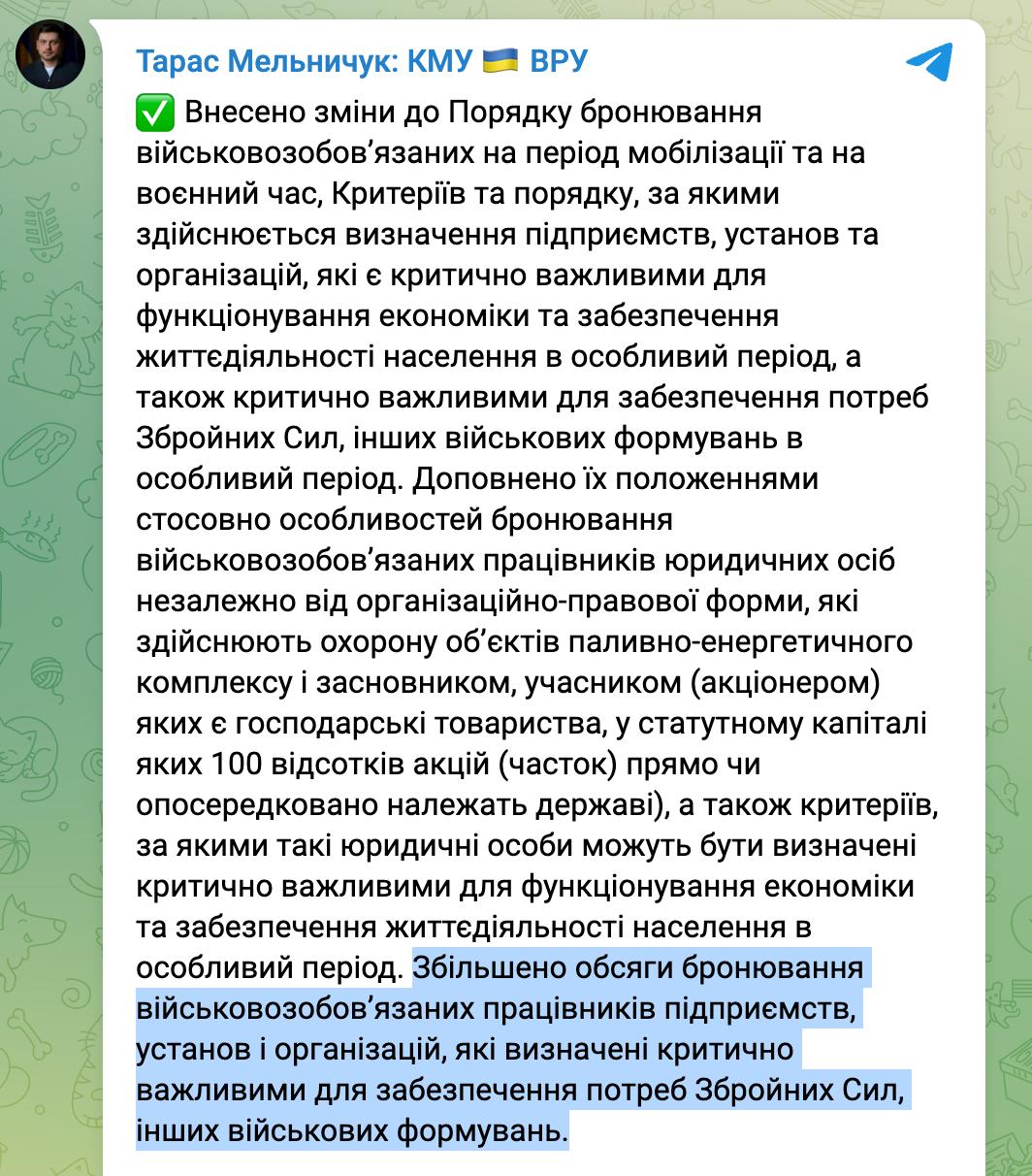 15:45 Предприятия, критические для работы ВСУ, теперь смогут бронировать до 100% работников, уточняет Минэкономики решение Кабмина.