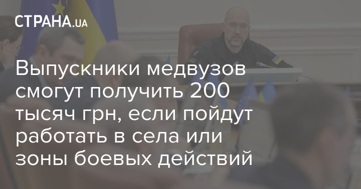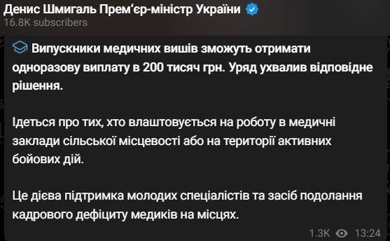 "Выпускники медицинских вузов смогут получить единоразовую выплату в 200 тысяч грн. Правительство приняло соответствующее решение. Речь идет о тех, кто устраивается на работу в медицинские учреждения сельской местности или на территории активных боевых действий", - написал он.