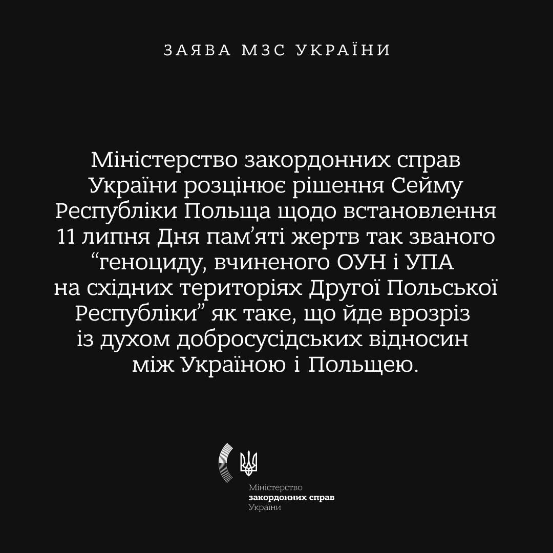 При этом в Министерстве иностранных дел Украины заявили, что решение об установлении даты "противоречит духу добрососедских отношений между Украиной и Польшей", а также "не способствует достижению взаимопонимания и примирения".