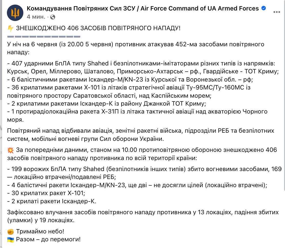 Сегодня ночью россияне атаковали Украину 452 средствами воздушного нападения. Среди них, 407 беспилотников, шесть баллистических ракет Искандер-М/KN-23, 36 крылатых ракет Х-101, две крылатые ракеты Искандер-К и одна противорадиолокационная ракета Х-31П.