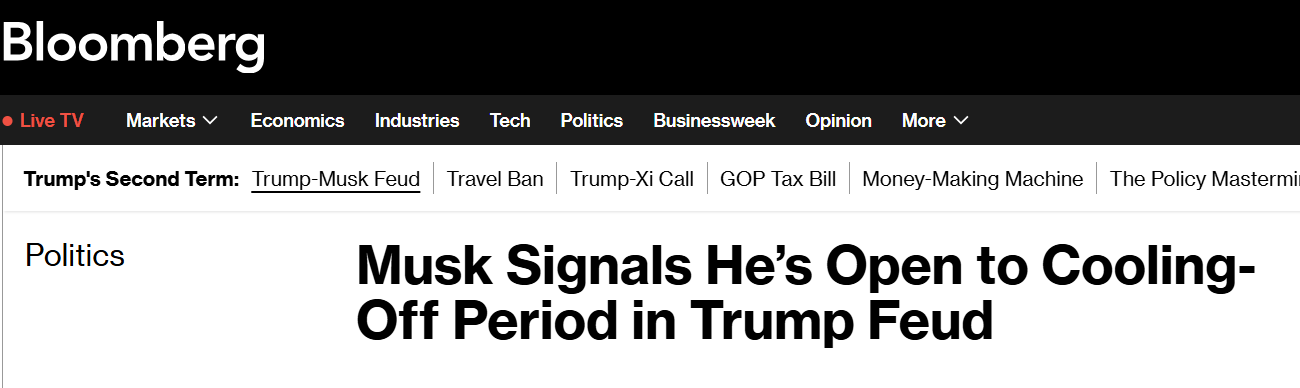 Bloomberg полагает, что Маск тем самым дает понять, что "будет стремиться к снижению напряженности в отношениях с президентом США" после того, как их конфликт вчера перешел в открытую плоскость.