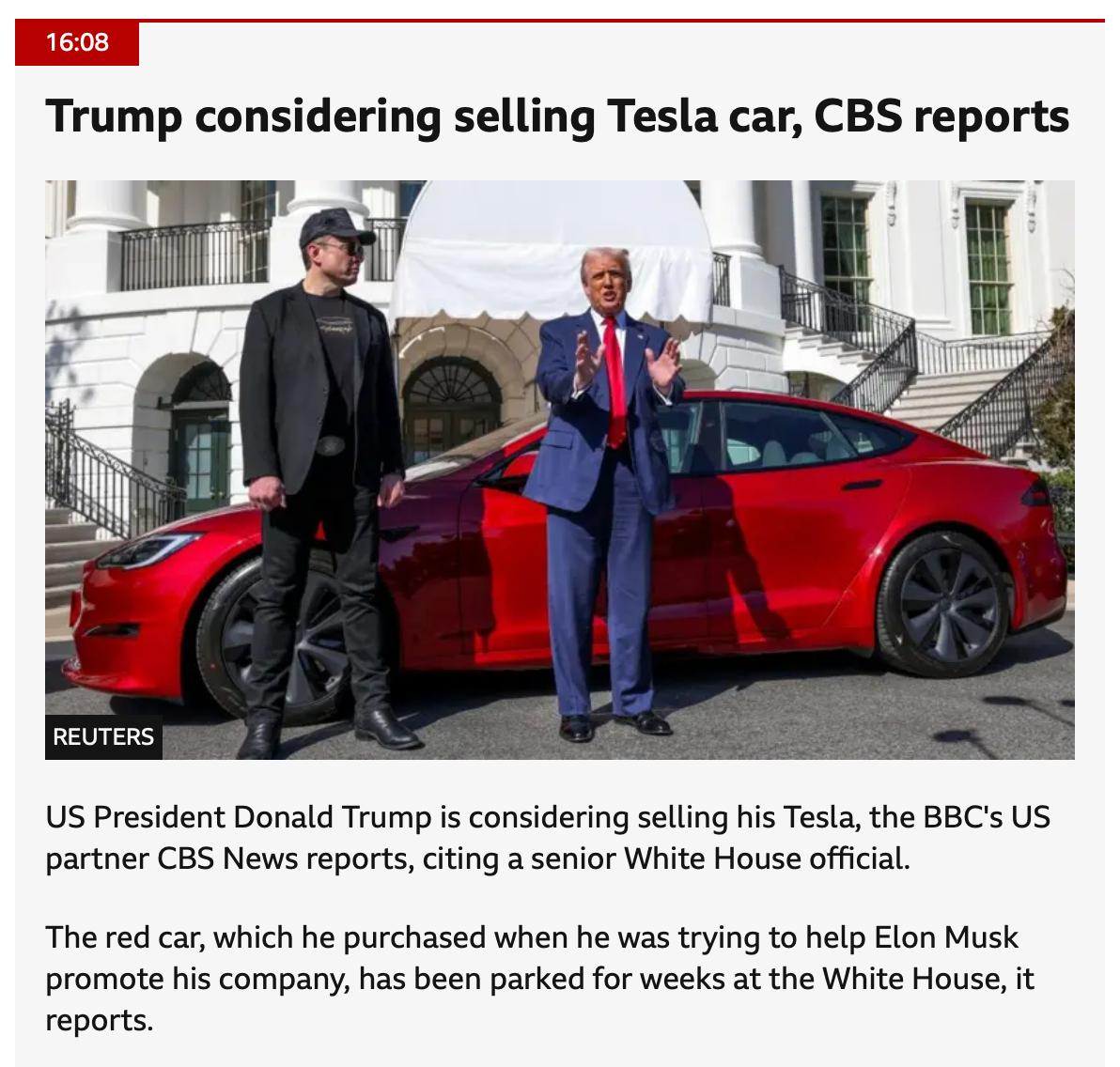 Между тем Трамп задумался о продаже своей красной Tesla, которую купил в начале года, чтобы помочь Маску во время падения акций его кампании из-за сближения с ним, сообщает CBS со ссылкой на источник в Белом доме. Все эти месяцы автомобиль просто стоял на парковке возле администрации.