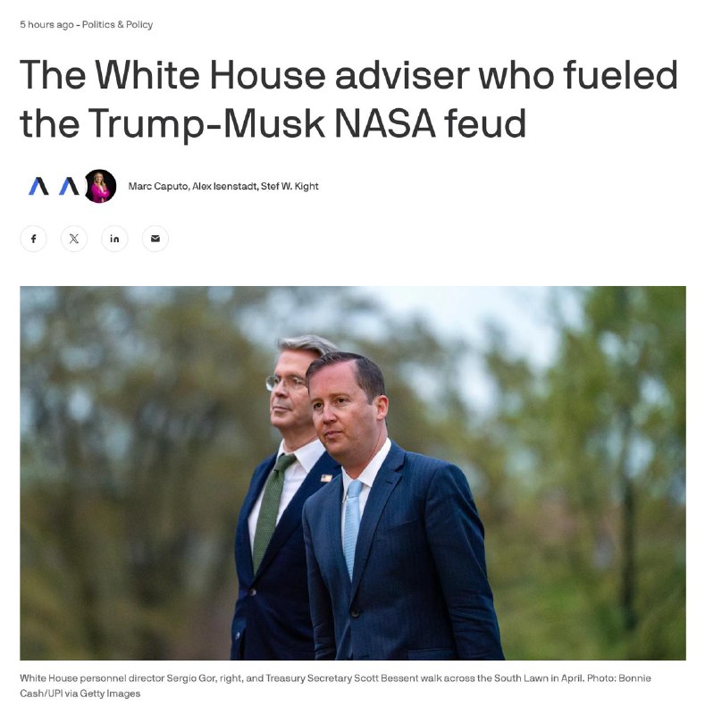 Гор является одним из самых влиятельных советников Трампа в Белом доме и соучредителем издательства на паях с сыном президента. Его напряженные отношения с Маском стали очевидны в марте, во время спора на заседании кабинета министров, на котором Маск поссорился с госсекретарем Марко Рубио.