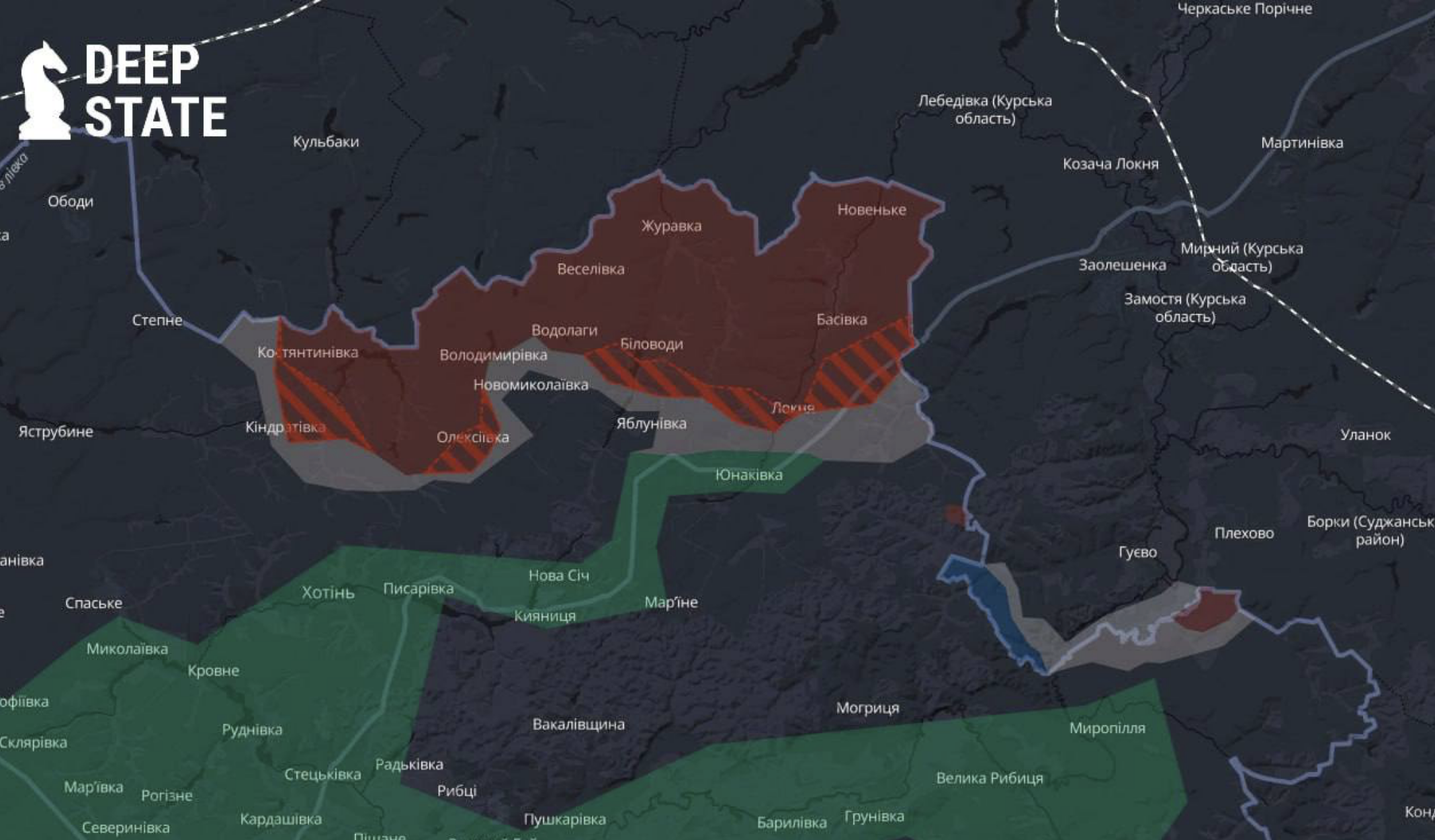 Сложная ситуация складывается и на участке Новониколаевка-Варачино-Яблоновка-Юнаковка, где российские военные пытаются занять населенные пункты и закрепиться, несмотря на значительные разрушения в Юнаковке. В районе Локни ВС РФ пытается продвигаться восточнее села в леса в направлении Садков, что создает серьезные сложности для его вытеснения.