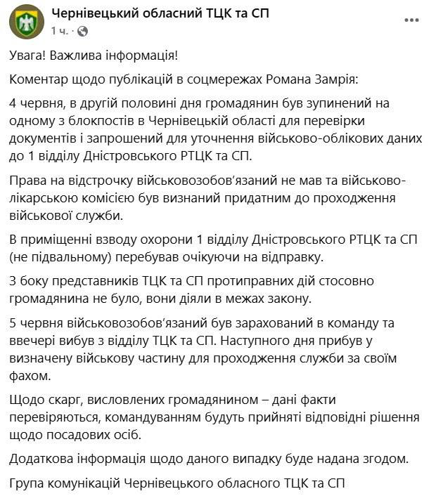 В Черновицком областном ТЦК и СП отреагировали на заявления волонтера Романа Замрия о том, что его мобилизовали, несмотря на право на отсрочку.
