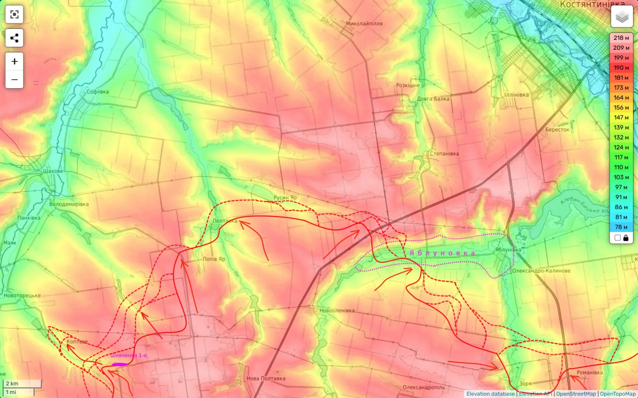 А именно - к югу от Константиновки, в районе села Яблоновка. Украинский боец с позывным "Мучной" пишет, что поля к югу от Яблоновки и соседнего с ней Александро-Калиново уже заняты россиянами. А логистика ВСУ севернее уничтожается дронами.