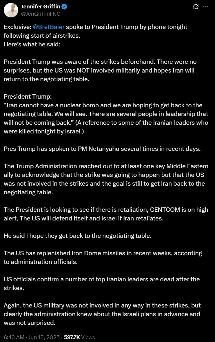 При этом, как сообщила Гриффин, Трамп выразил готовность защитить Израиль в случае ответного удара Ирана.