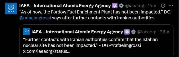 Иранское агентство по атомной энергии, со своей стороны, заявило, что «в случае Фордо ущерб ограничивался местами, которые не вызывали разрушений в городе Фордо… В Исфахане также были атаки в нескольких точках, связанных со складами, которые загорелись».