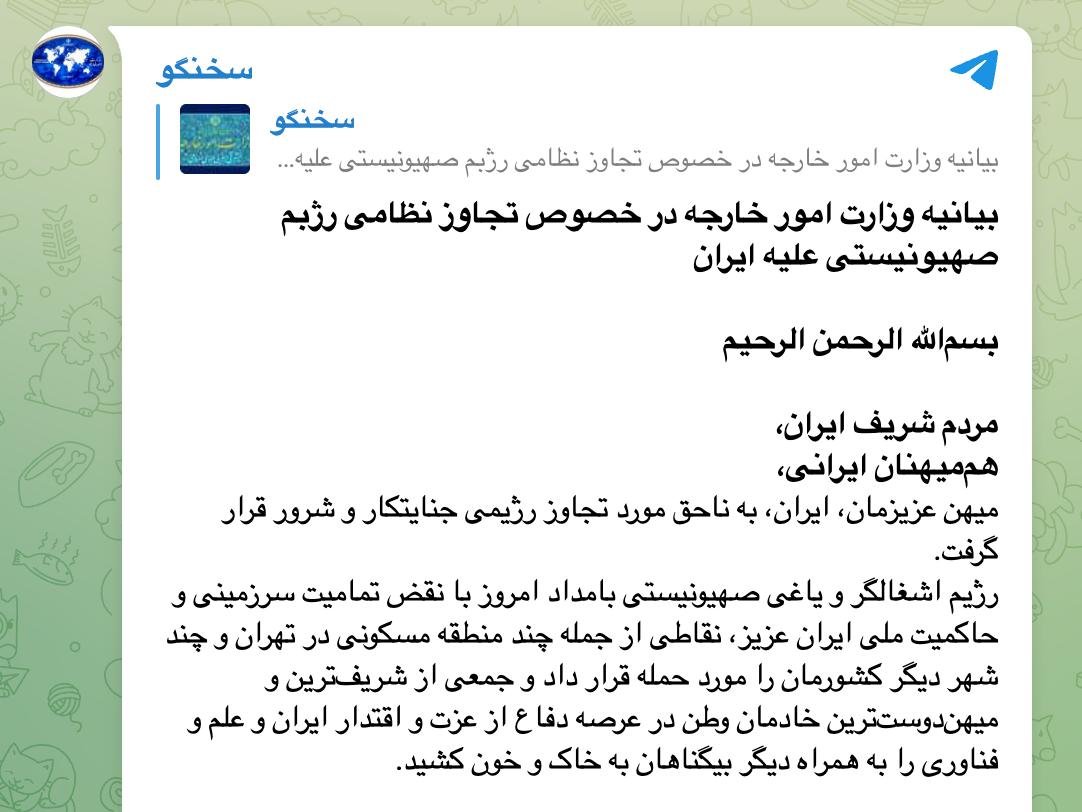 "Агрессивные действия сионистского режима против Ирана не могли быть осуществлены без координации и разрешения Соединенных Штатов. Соответственно, правительство США, как главный сторонник этого режима, также будет нести ответственность за опасные эффекты и последствия авантюризма сионистского режима", - заявляет иранский МИД.