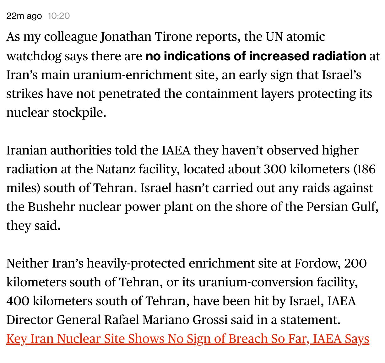 Как передает Bloomberg, на главном иранском объекте по обогащению урана нет признаков повышенной радиации, что было бы первым признаком успеха ударов.