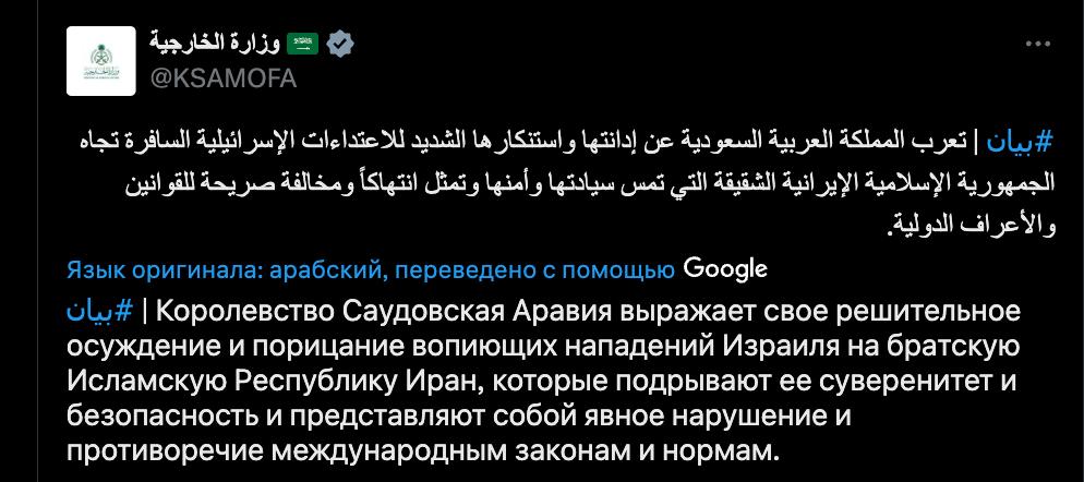 "Саудовская Аравия выражает свое решительное осуждение и порицание вопиющих нападений Израиля на братскую Исламскую Республику Иран, которые подрывают ее суверенитет и безопасность и представляют собой явное нарушение и противоречие международным законам и нормам", - заявил МИД страны.