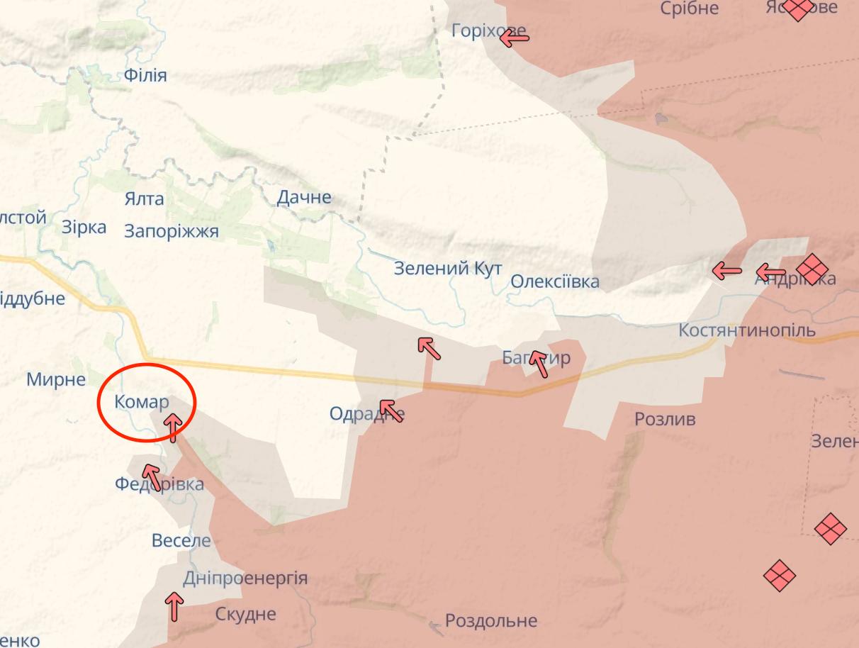 Минобороны России заявляет о захвате тактически важного села Комар, что около основной трассы на юге Донецкой области. Украина этого не подтверждала. На карте Deep State указана лишь серая зона на окраине села.