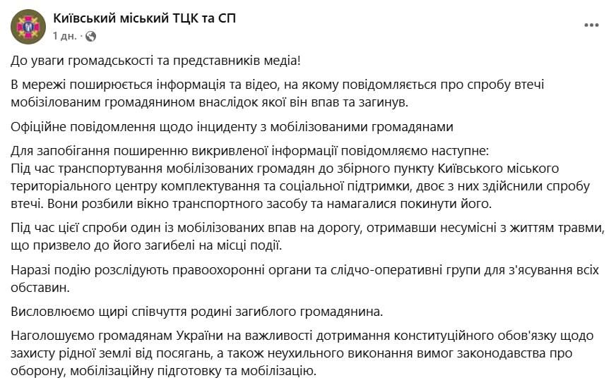 В Киеве погиб мобилизованный мужчина при попытке сбежать из буса ТЦК
