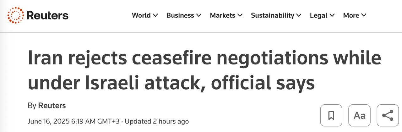 10.56 МИД Ирана официально заявил, что отказывается вести переговоры, пока Израиль продолжает наносить удары. Ранее о такой позиции Тегерана сообщали СМИ.