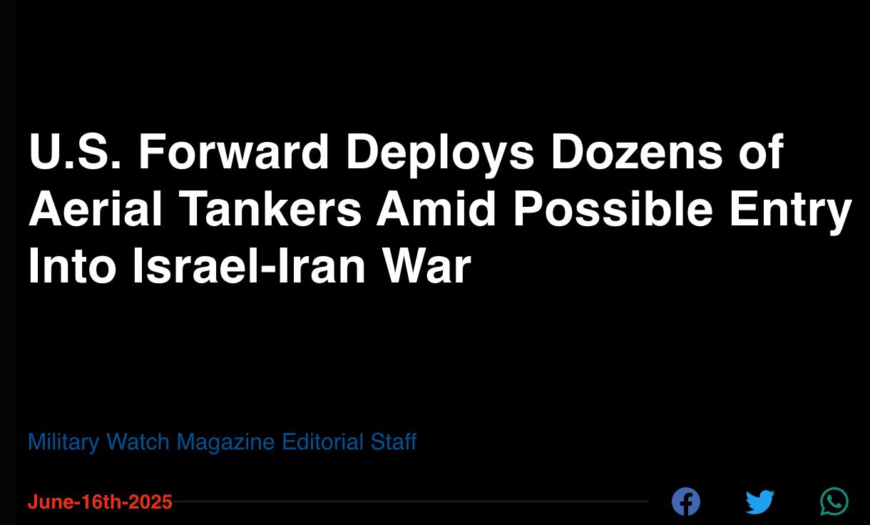 9.40 США перекидывают свои самолеты-заправщики через Атлантический океан в "беспрецедентно массовом" масштабе, возможно, для участия в войне Израиля и Ирана, сообщает Military Watch Magazine