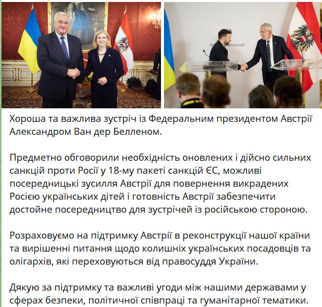 "Рассчитываем на поддержку Австрии в реконструкции нашей страны и решении вопроса о бывших украинских чиновниках и олигархах, которые скрываются от правосудия Украины", – написал президент Украины.