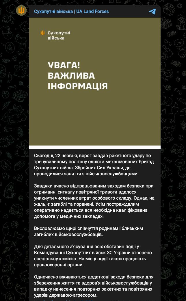 17:23 22 июня российские войска нанесли ракетный удар по учебному полигону одной из механизированных бригад ВСУ, где проходили занятия с личным составом.