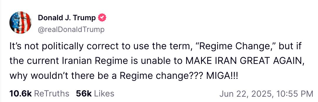 "Политкорректно не использовать выражение "смена режима", но если нынешний иранский режим не способен сделать Иран великим снова, почему бы тогда не сменить режим?" - написал он, завершив пост аббревиатурой MIGA (Make Iran Great Again).