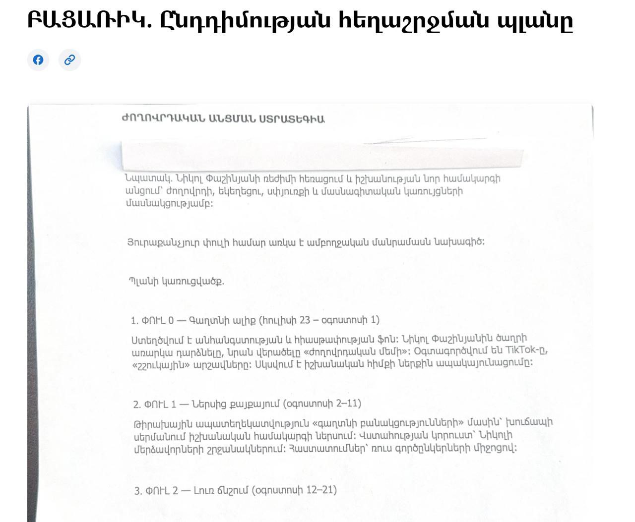 Как утверждается в документе, план разработан оппозиционными силами и направлен на свержение Пашиняна. В числе упомянутых участников - экс-президенты Роберт Кочарян и Серж Саргсян, упомянутый выше Самвел Карапетян, принадлежащие россиянам компании "Газпром Армения" и Южно-Кавказская железная дорога, а также представители Армянской апостольской церкви.