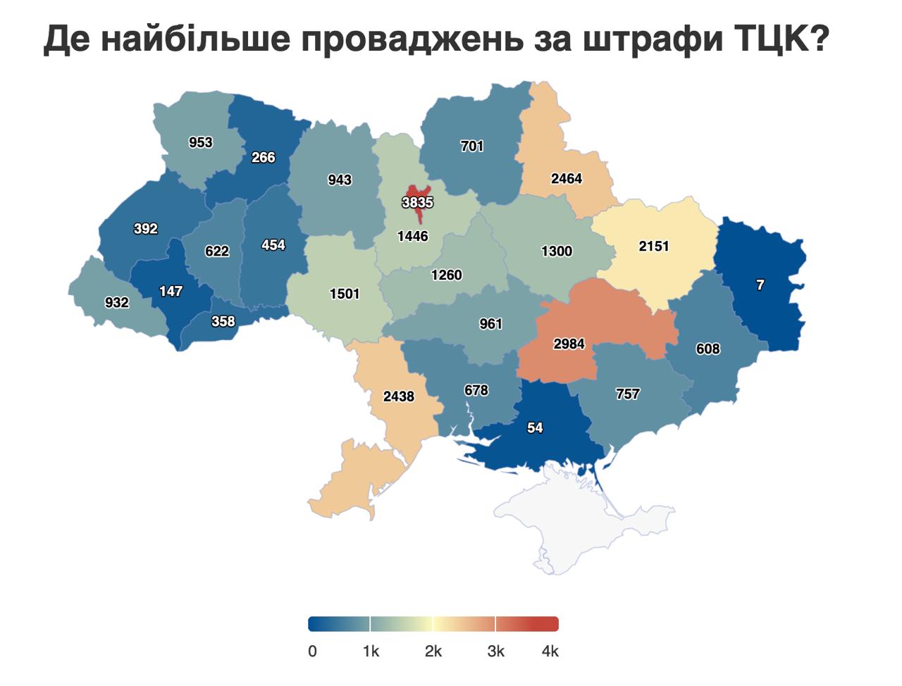 Лидером по количеству штрафов от ТЦК является Киев - там с начала года открыто 3 835 производств. Далее следуют Днепропетровская (2 984), Сумская (2 464), Одесская (2 438) и Харьковская (2 151) области. Всего девять регионов уже имеют более тысячи дел. В Киеве самым активным стал Подольский ТЦК, открывший 1 100 производств только за первую половину года.