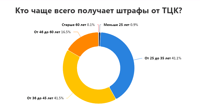 В целом почти все производства касаются мужчин, на женщин открыто только 46 производств, что составляет 0,16% от общего количества. Чаще всего ТЦК открывают производство против мужчин в возрасте от 25 до 45 лет — таких случаев 82%.