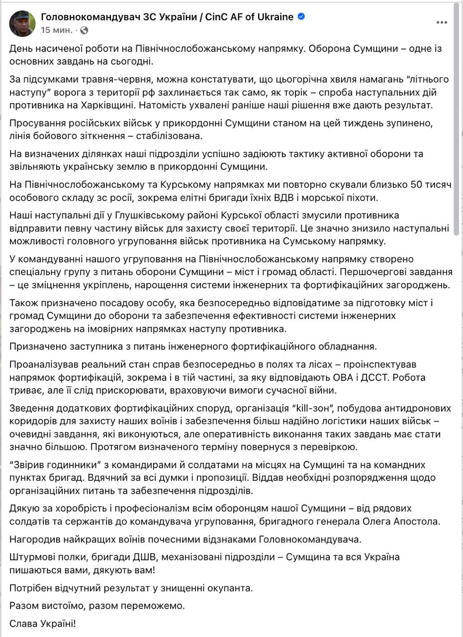 "Продвижение российских войск в приграничной зоне Сумщины на этой неделе остановлено, линия боевого соприкосновения - стабилизирована. На определённых участках наши подразделения успешно применяют тактику активной обороны и освобождают украинскую землю в приграничье Сумской области. По итогам мая-июня можно констатировать, что нынешняя волна попыток "летнего наступления" врага с территории РФ захлёбывается так же, как и в прошлом году - тогда это была попытка наступательных действий противника на Харьковщине", - пишет Сырский.