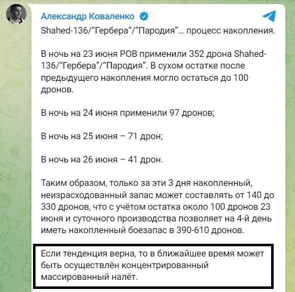 По его подсчетам, с учетом трех дней без ударов и предыдущих накоплений у РФ может быть до 600 "лишних" дронов, которые она может использовать в ближайшие дни.