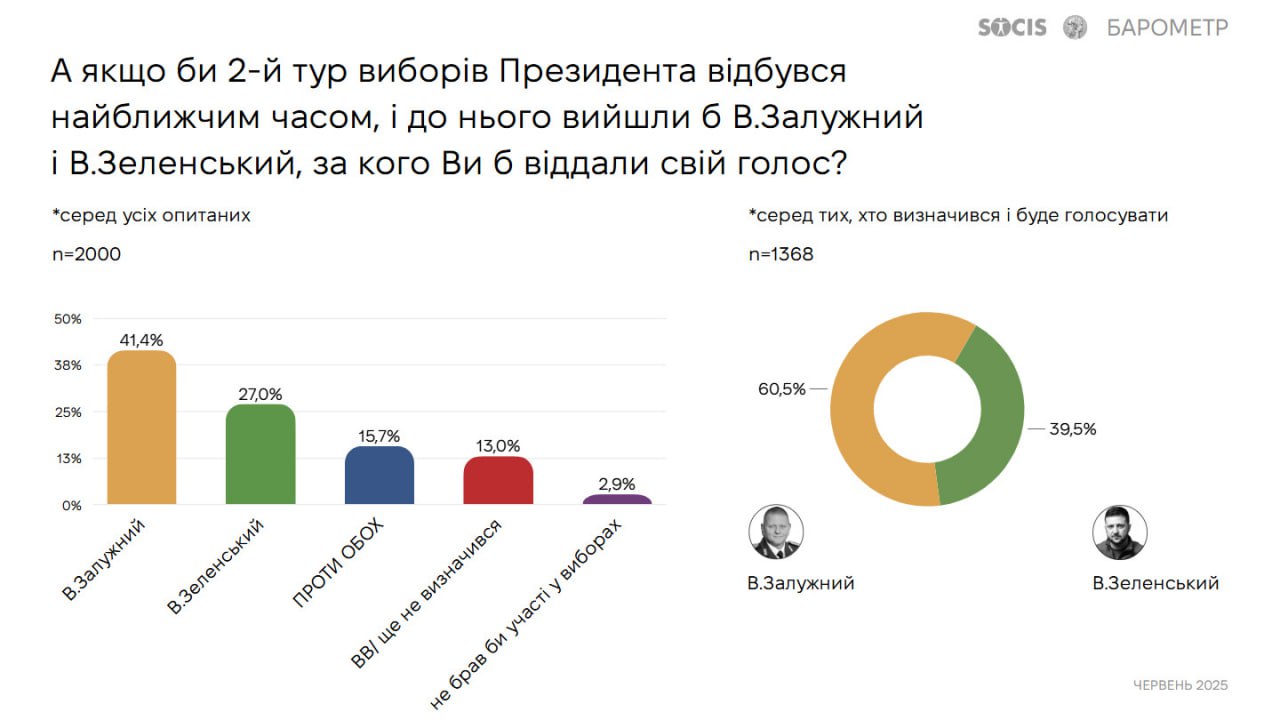 Согласно данным исследования, экс-главком ВСУ набрал бы 41,4% избирателей, а действующий президент 27%. 15,7% респондентов проголосовали бы против обоих.