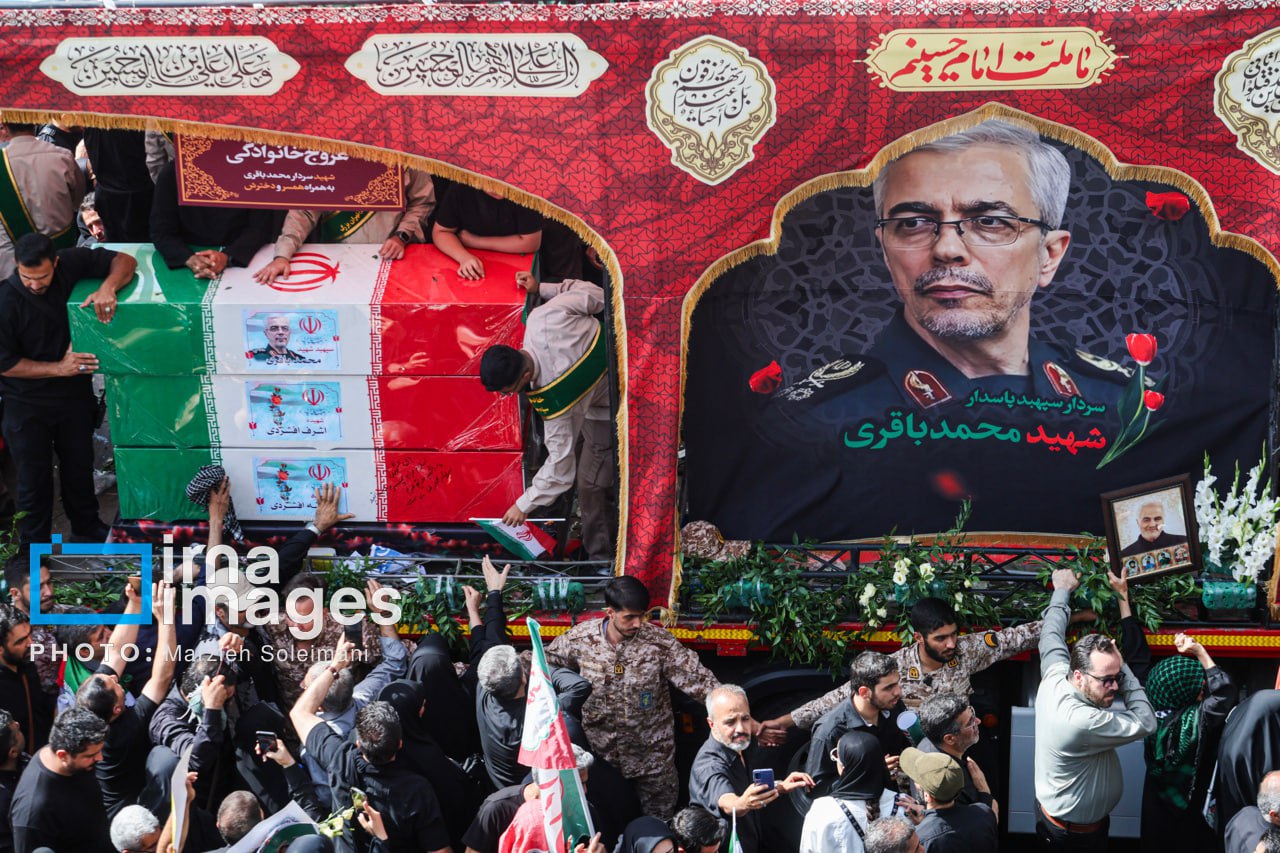 Гробы с телом верховного главнокомандующего Корпуса стражей исламской революции (КСИР) Ирана Хоссейна Салами, а также командующего ВВС КСИР генерала Амира Али Хаджизаде везли в центре Тегерана.