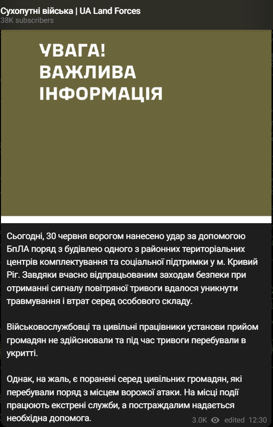 Сегодня россияне нанесли удар БПЛА рядом со зданием одного из районных территориальных центров комплектования и социальной поддержки в Кривом Роге.