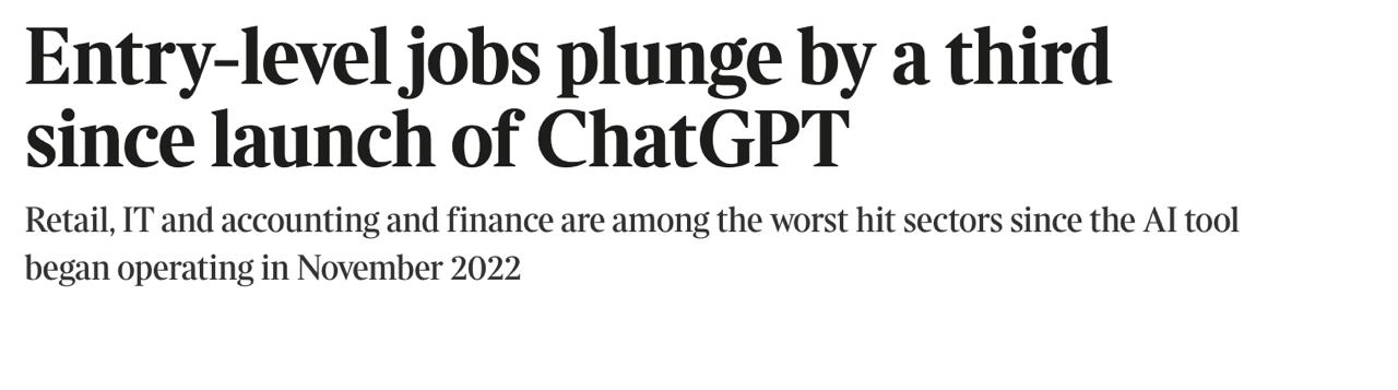 На сайте по поиску работы Adzuna количество вакансий для выпускников, стажеров, интернов и младших специалистов без требования высшего образования сократилось на 31,9% с ноября 2022 года, когда был запущен этот ИИ-сервис.