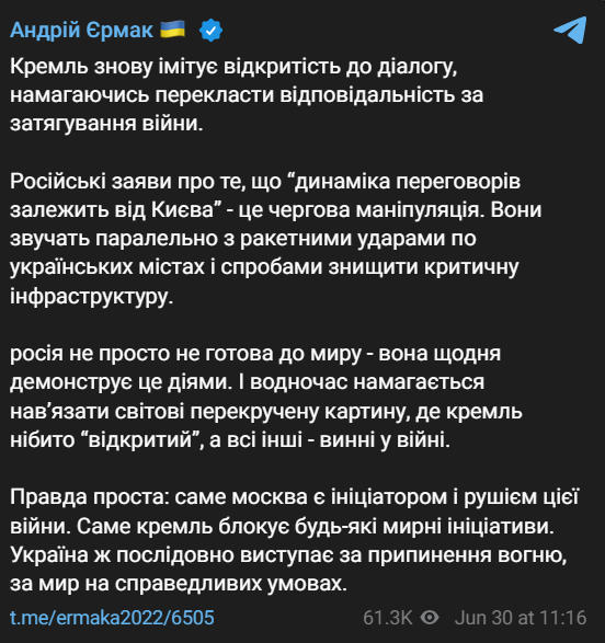 Кремль сделал очередное заявление об условиях для прекращении огня. Ермак ответил