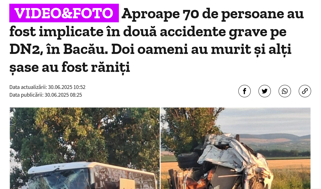 "В результате дорожно-транспортного происшествия пострадали пять человек в возрасте от 27 до 65 лет - четверо в микроавтобусе и один в автобусе, а также погибла 29-летняя женщина из коммуны Агэш, находившаяся в микроавтобусе", - сообщили представители полиции Бакэу.