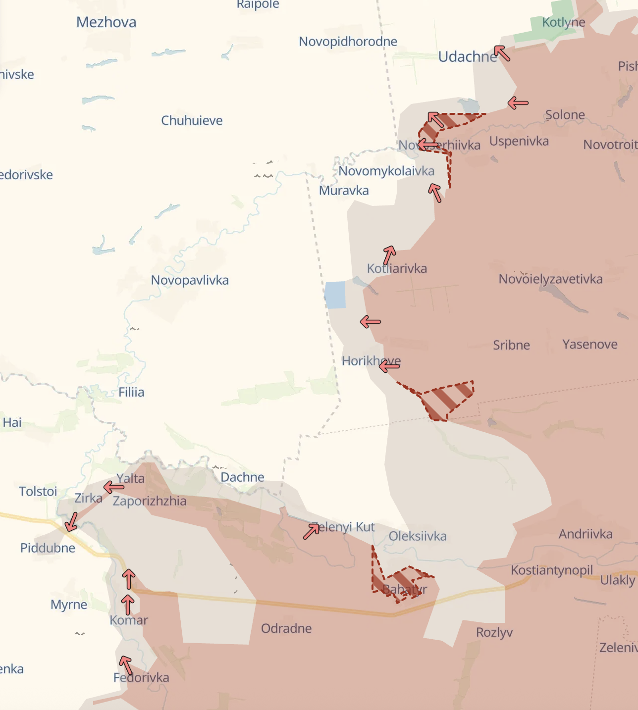 В то же время Deep State фиксирует ряд других продвижений у границ Днепропетровской области - в Новосергеевке и Богатыре (по данным "Мучного", оба села давно захвачены), а также в районе Орехового.