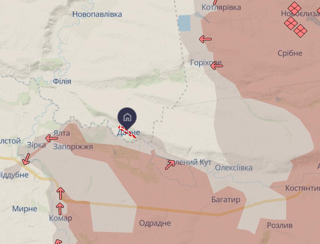 На свежей карте Deep State Дачное находится под контролем ВСУ, а минимальный участок на краю села в серой зоне.