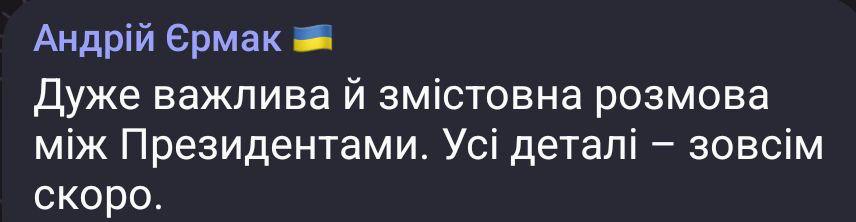 "Сегодня мы говорили о ситуации: о российских воздушных ударах и, в более широком смысле, о ситуации на фронте. Президент Трамп очень хорошо информирован, спасибо за это внимание к Украине. Обсудили возможности по ПВО и договорились, что будем работать над усилением защиты неба. Договорились о соответствующей встрече наших команд.