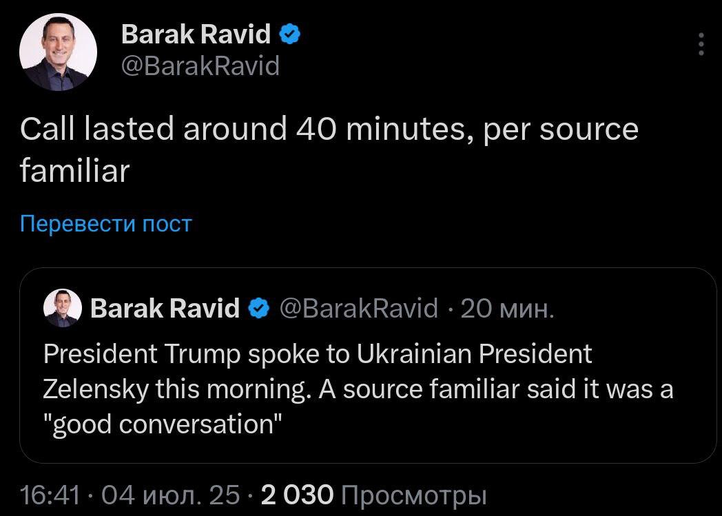 16.45 У Трампа и Зеленского был "хороший разговор", который длился около 40 минут, пишет журналист Axios Равид со ссылкой на источник.