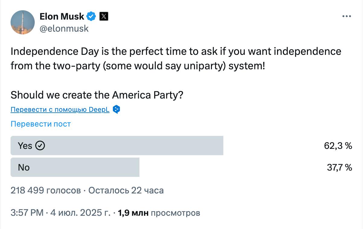 В соцсети Х миллиардер запустил опрос о необходимости создания Американской партии, приуроченный ко Дню независимости США.