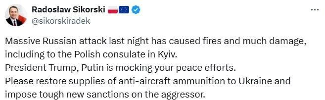 "Массированная российская атака вчера вечером вызвала пожары и нанесла большой ущерб, в том числе польскому консульству в Киеве. Президент Трамп, Путин насмехается над вашими мирными усилиями. Пожалуйста, возобновите поставки зенитных ракет в Украину и введите жесткие санкции против агрессора", – написал он.