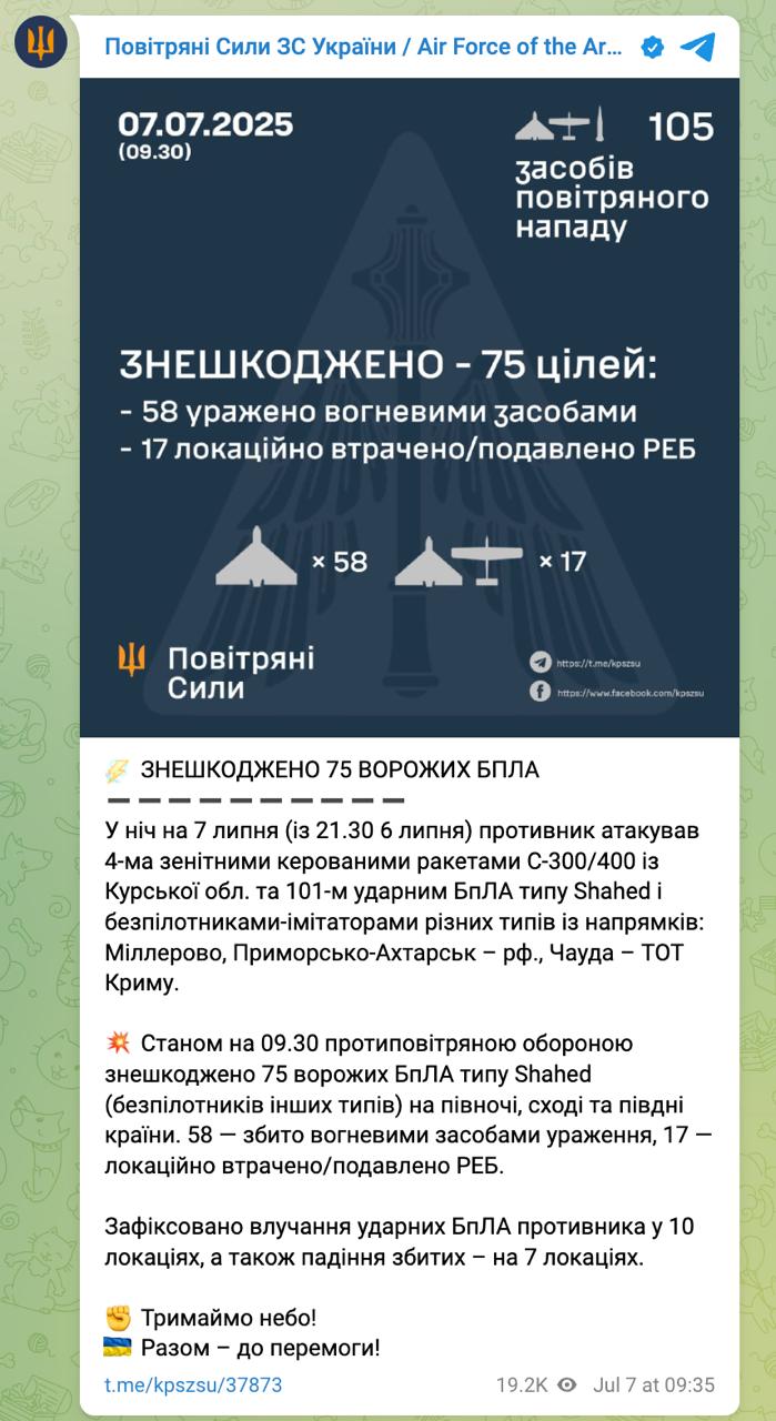 Обезвредить удалось 75 дронов из 101. Еще в 7 локациях упали обломки.